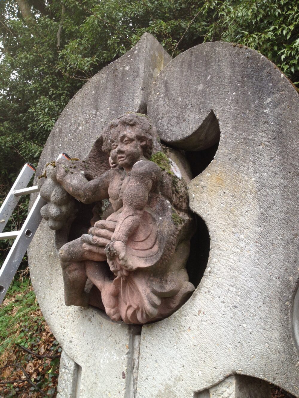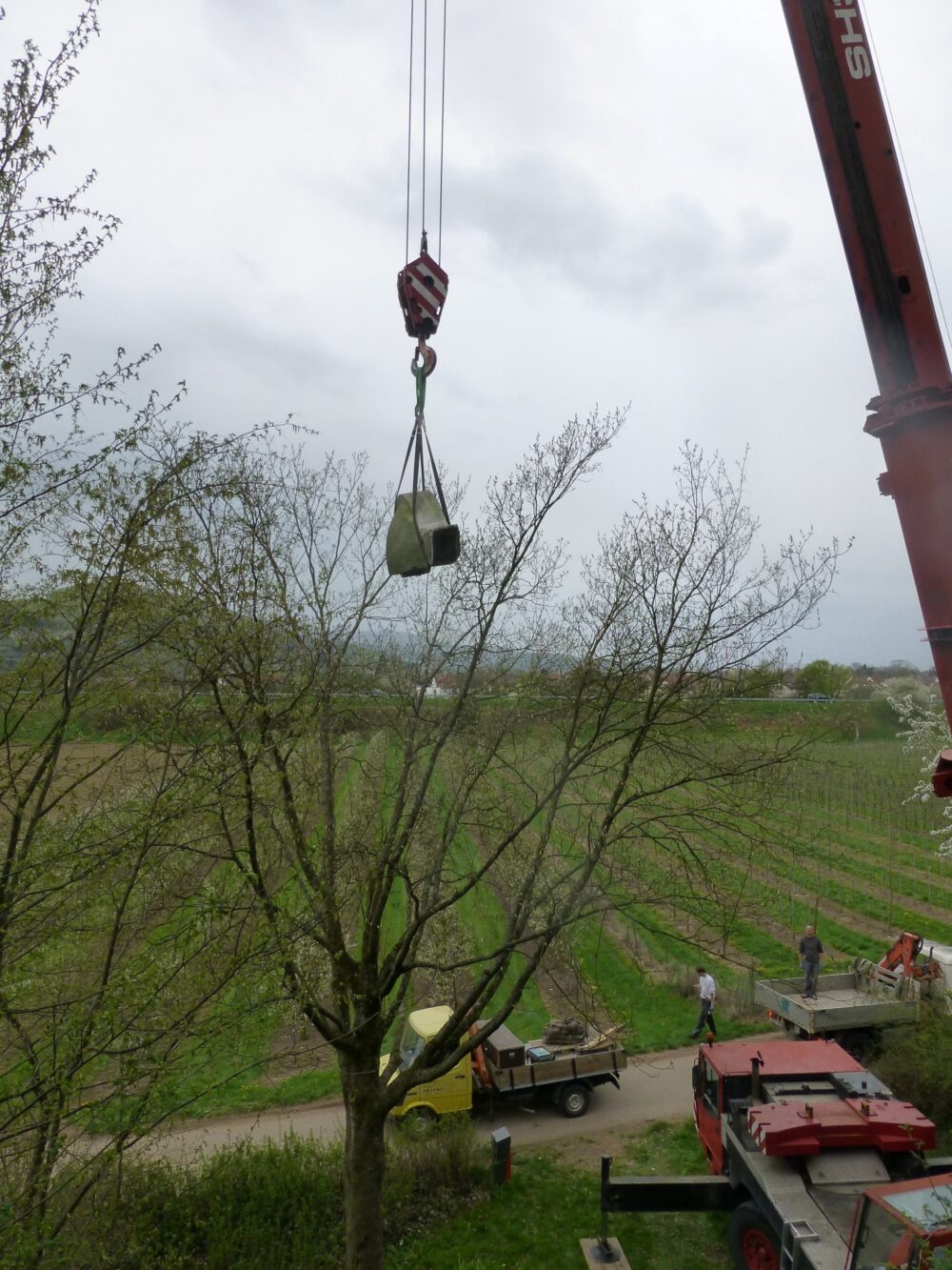 Maria und das Jesuskind vom Bildhauer Helmut Lutz, vor ca. 40 Jahren erschaffen, muss restauriert werden. Mit Hilfe eines 50 Tonnen Kranwagen, wurde das Denkmal von seinem Platz im Buchholzer Rebberg gehoben, auf Lkw's verladen und in unsere Werkstatt transportiert. Dort wurde die Plastik, die aus rotem Sandstein und Beton geschaffen wurde, liebevoll restauriert und gereinigt. Da die Standsicherheit, oben im Rebberg, nicht mehr gewährleistet war und der Zugang über eine steile, nunmehr marode, Treppe erfolgte, ist die Skulptur nach unten verlegt worden. Hier am Fuße des Rebberges hat sie nun einen neuen Platz gefunden und erfreut sich der vorbeikommenden Besucher.
